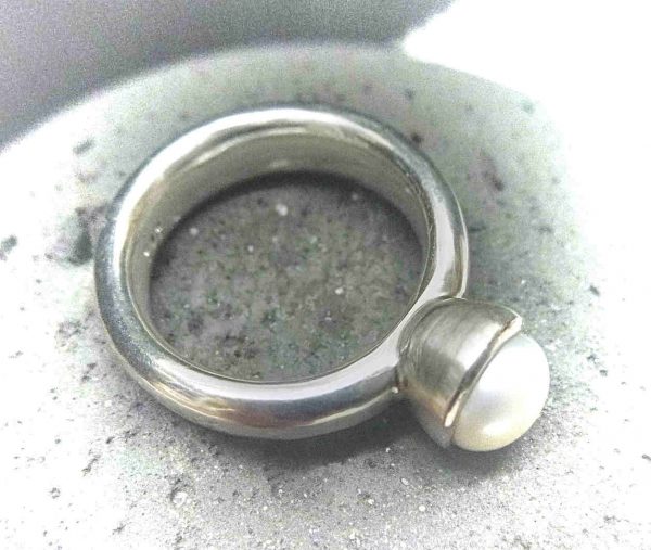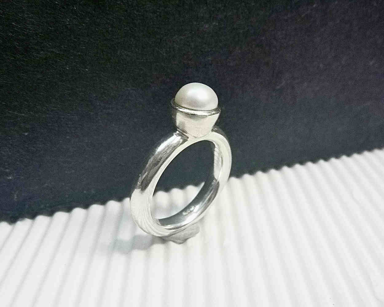 Silber-Ring mit SW-Perle in Silber gefasst, 925er Silber, aus eigener Werkstatt, handgemacht (hergestellt mit traditionellen Goldschmiedetechniken);
